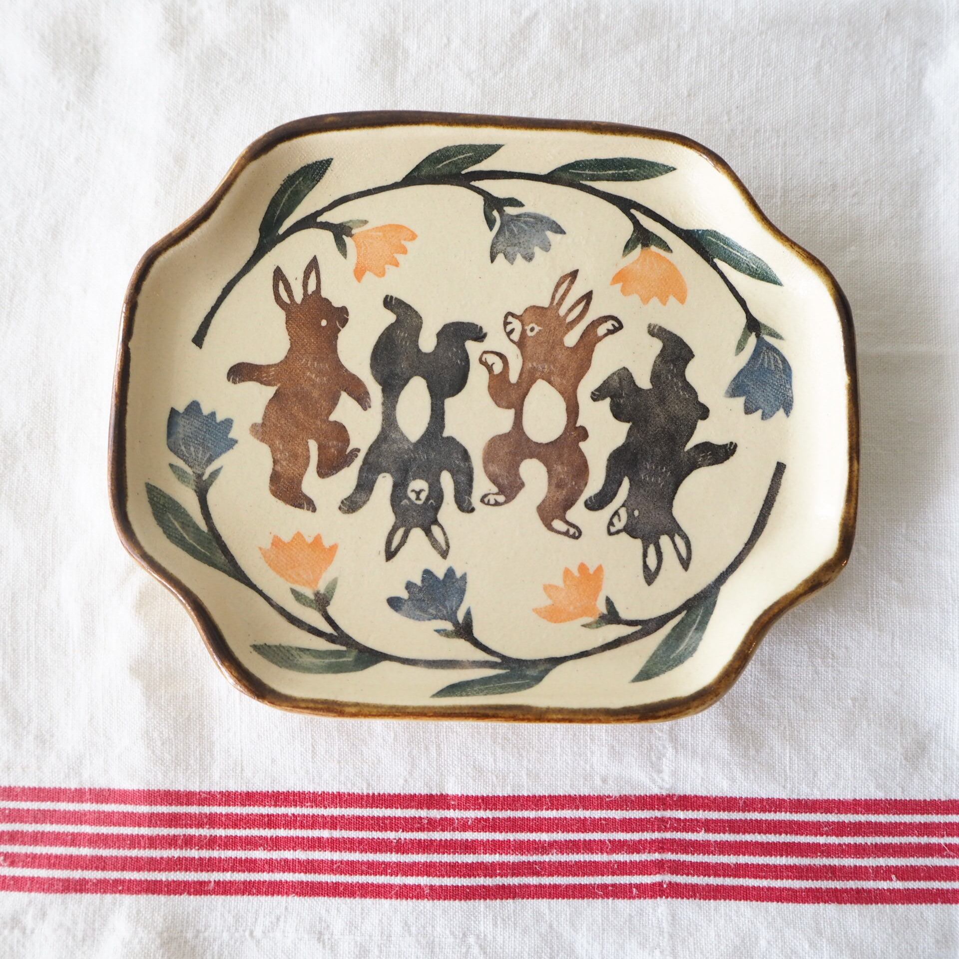 【なかがきともこ】水彩調鉄絵プレート ウサギと花