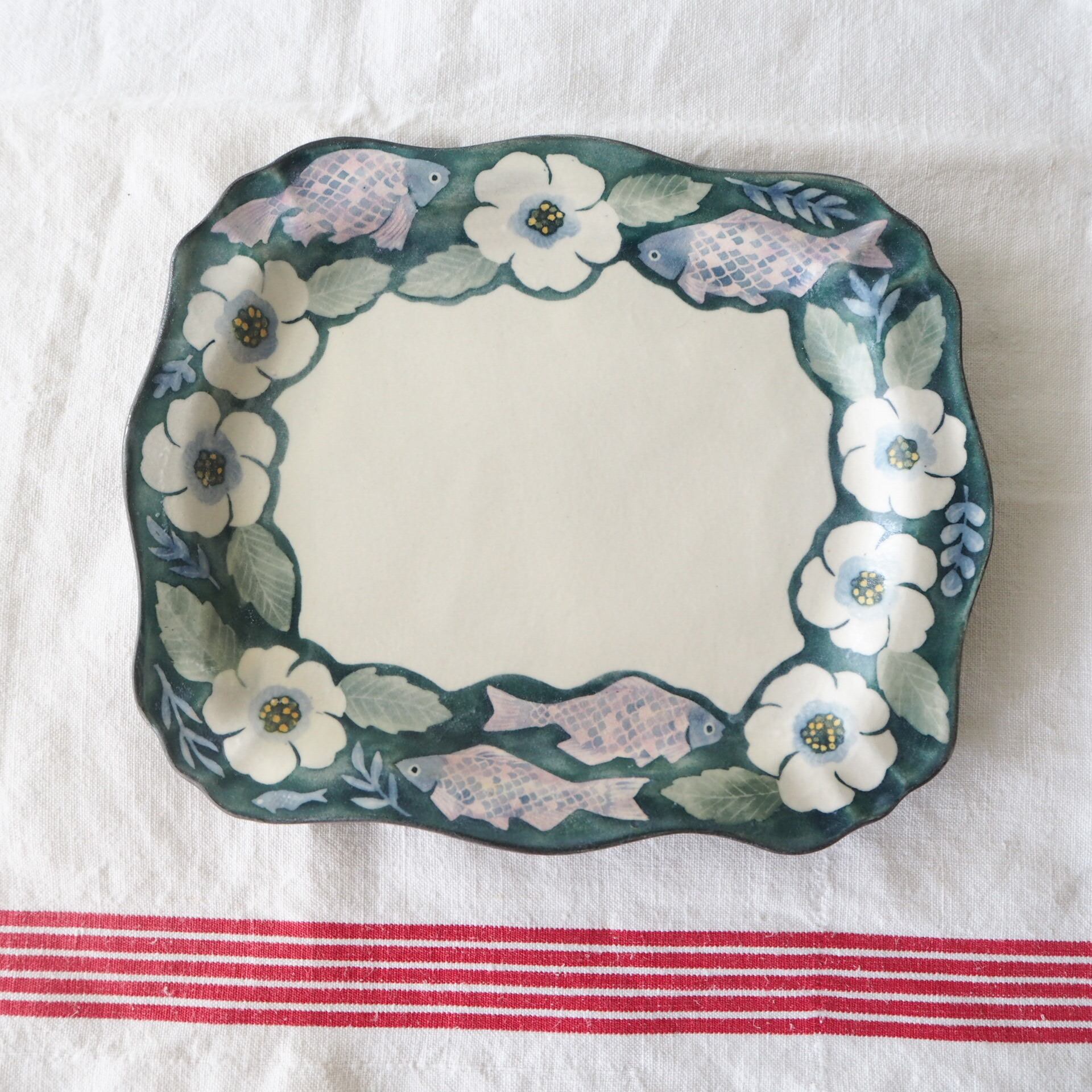 【なかがきともこ】粉引き絵付けプレート 花と魚