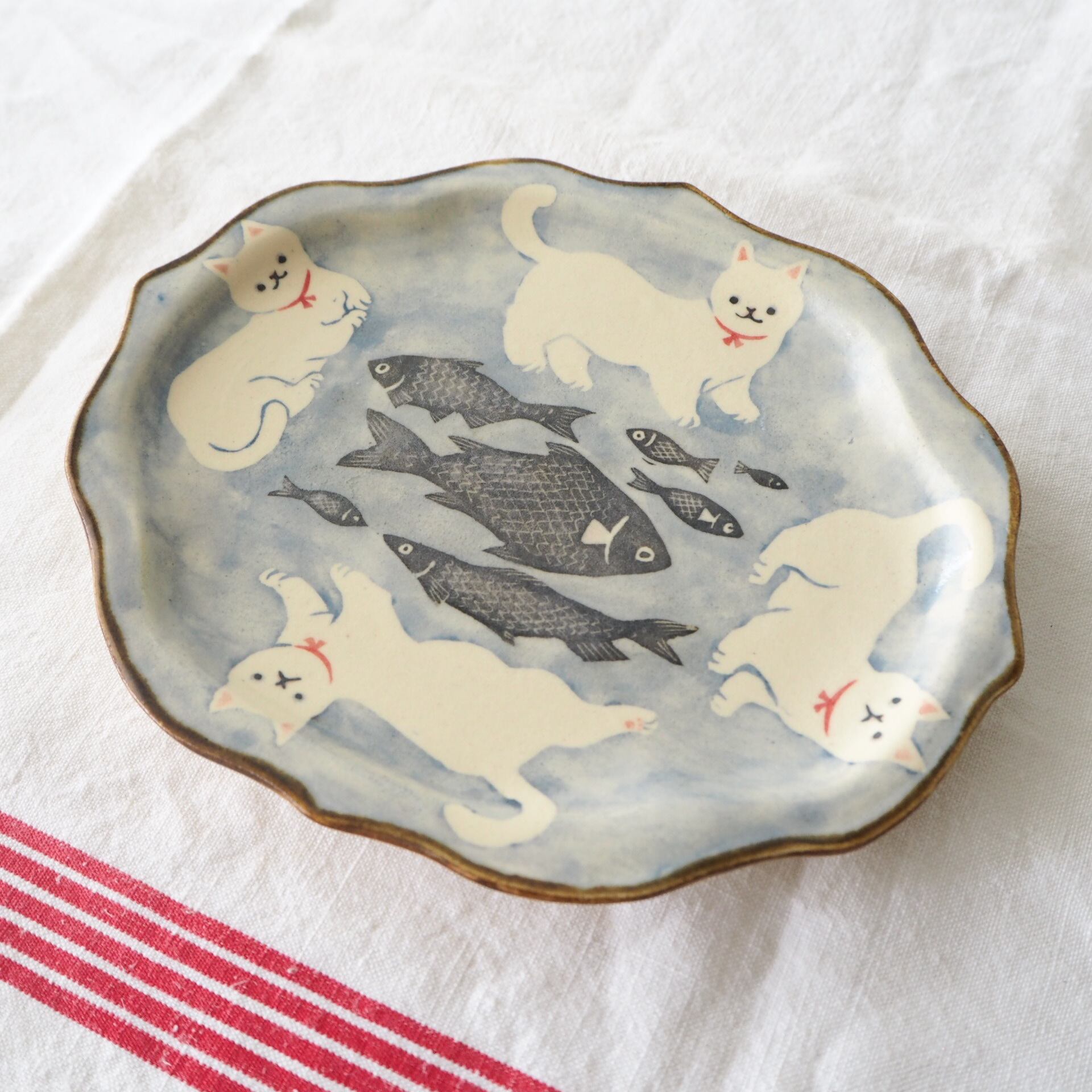 【なかがきともこ】水彩調鉄絵プレート 猫と魚