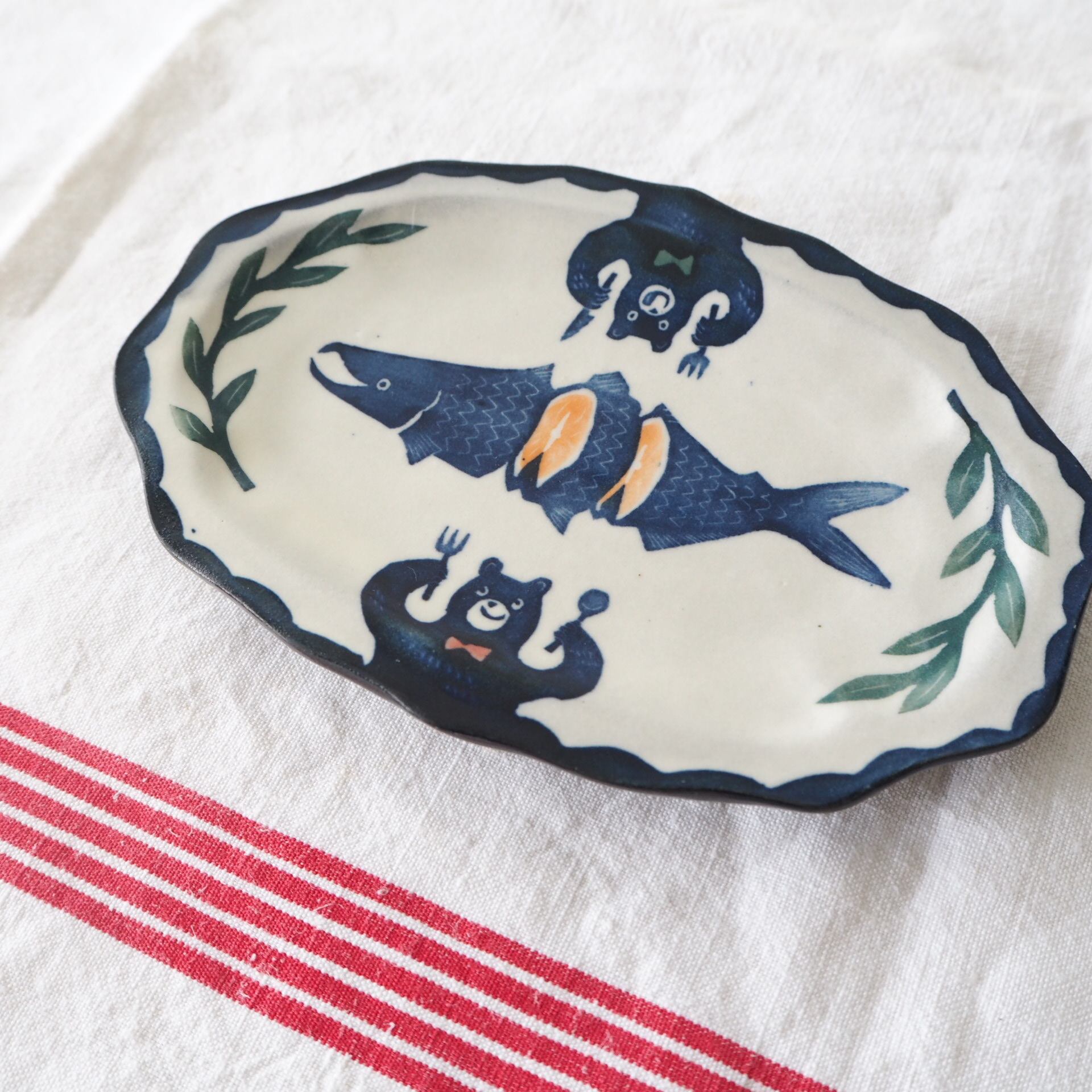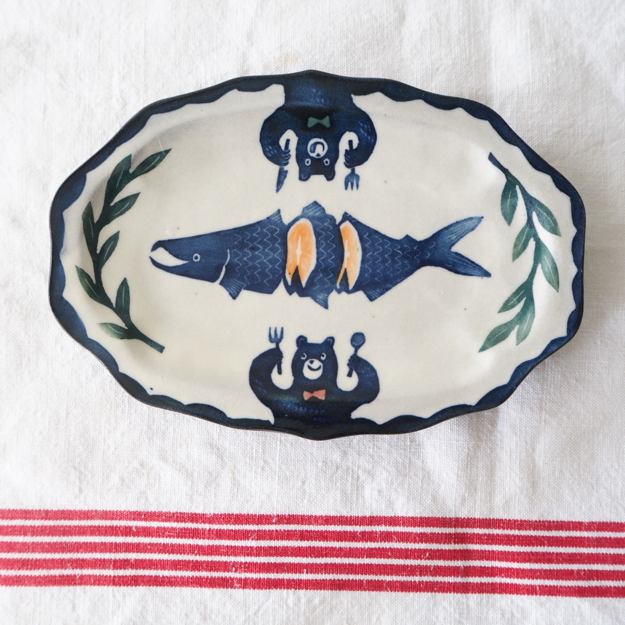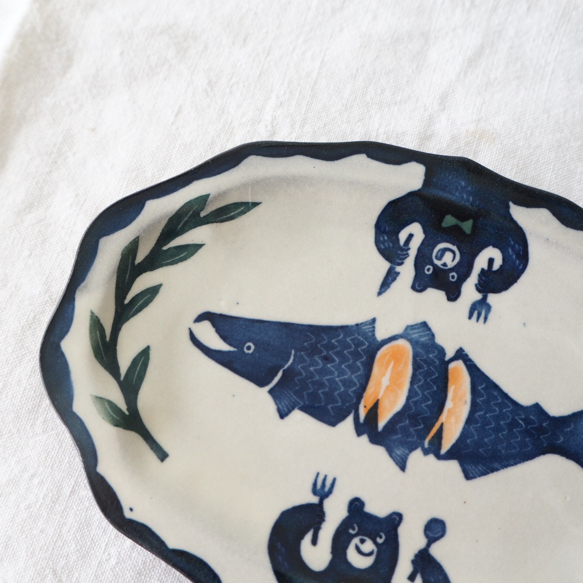 【なかがきともこ】粉引き絵付けプレート クマとサーモン